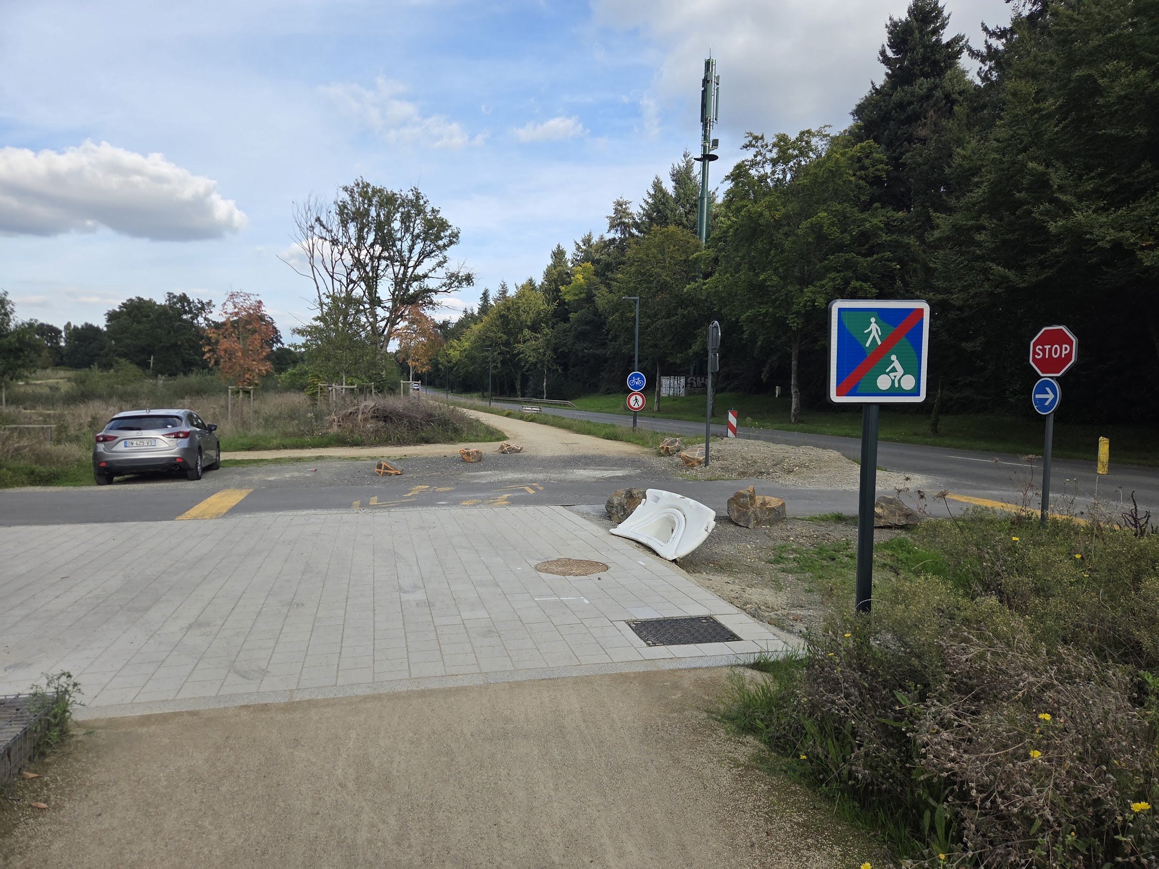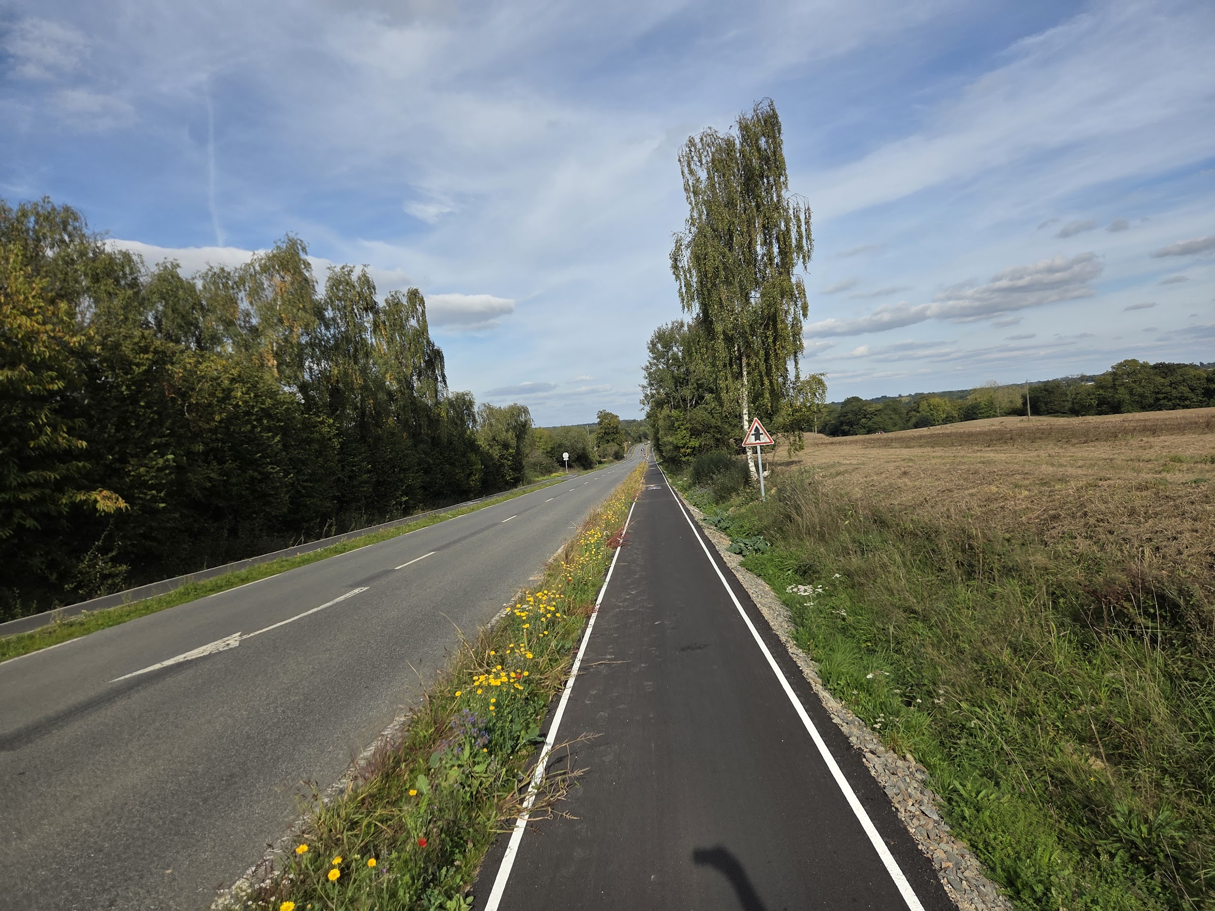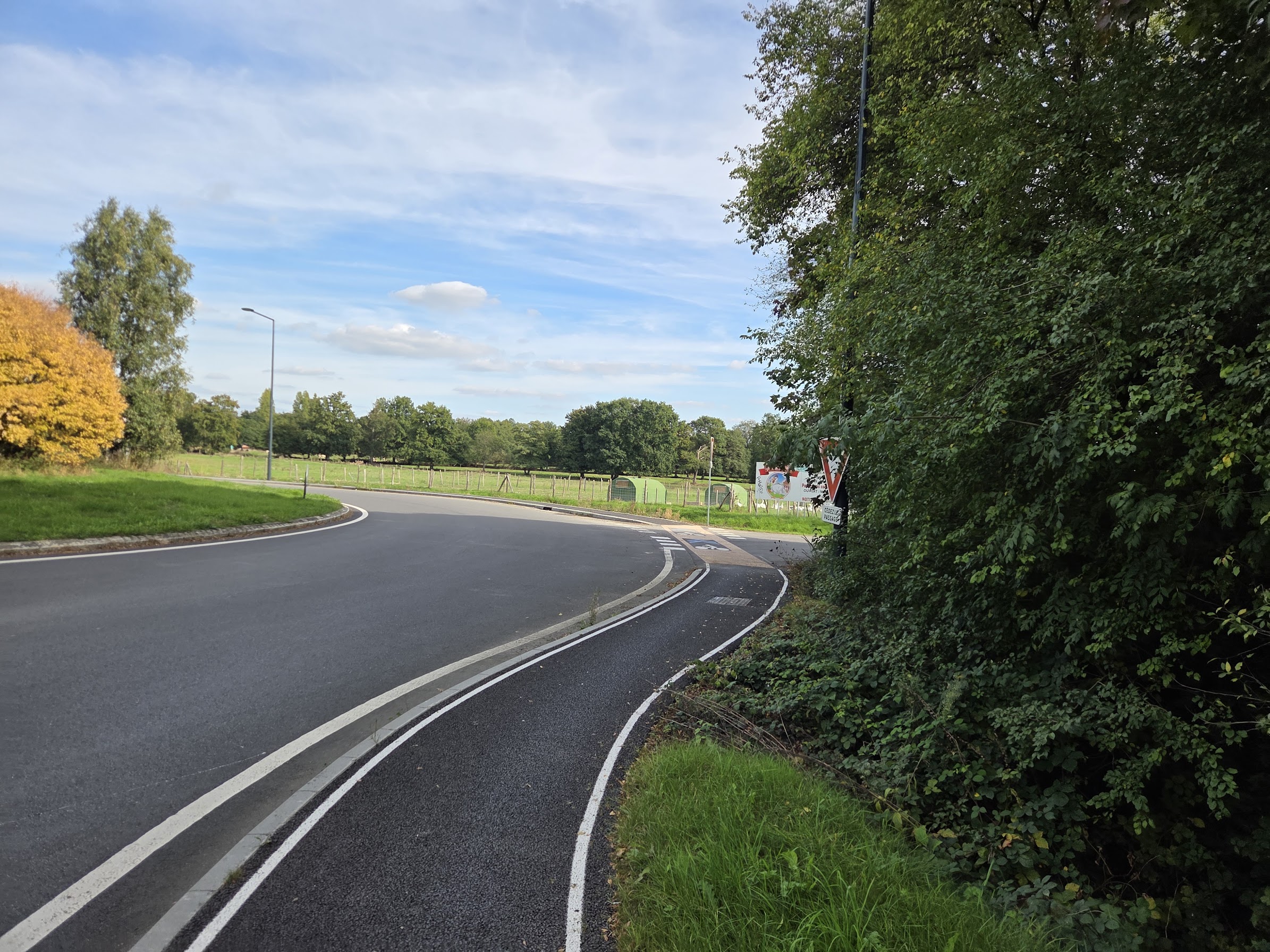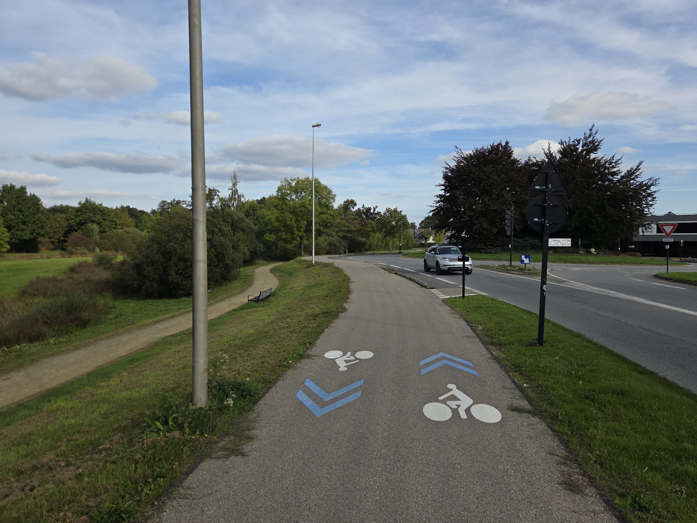 L'itinéraire se poursuit sous forme de vélorue avec un niveau d'aménagement minimaliste. Il y a cependant très peu de flux motorisé depuis que la route a été barrée pour les voitures rendant ce passage plutôt satisfaisant.