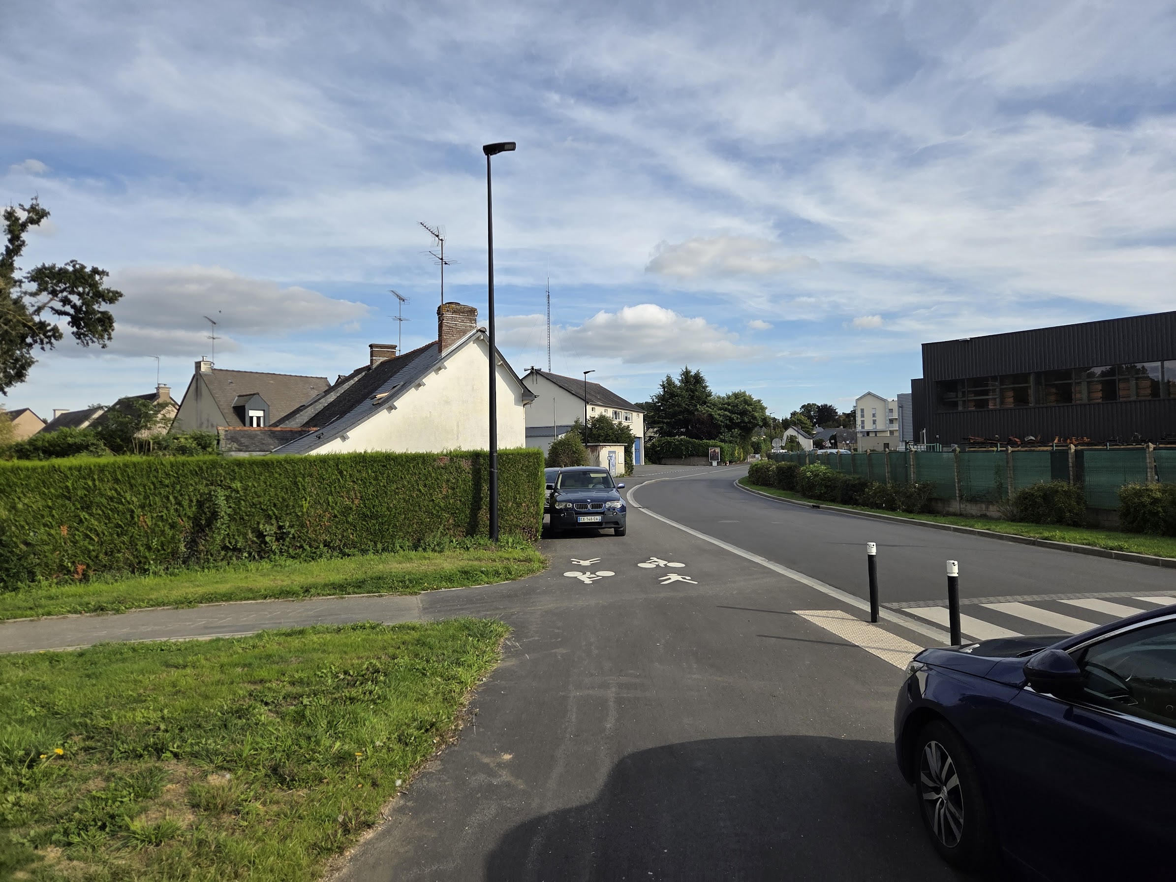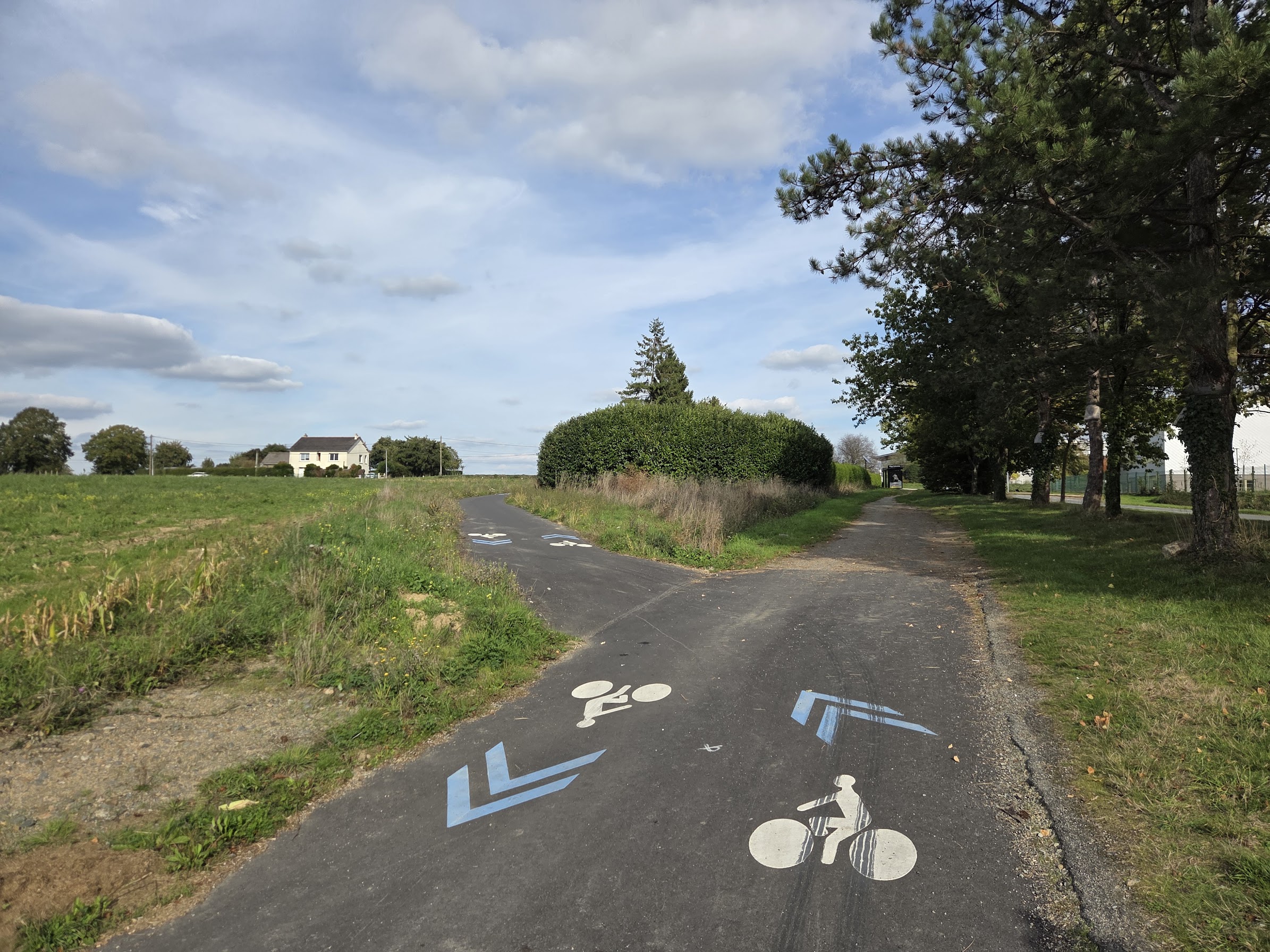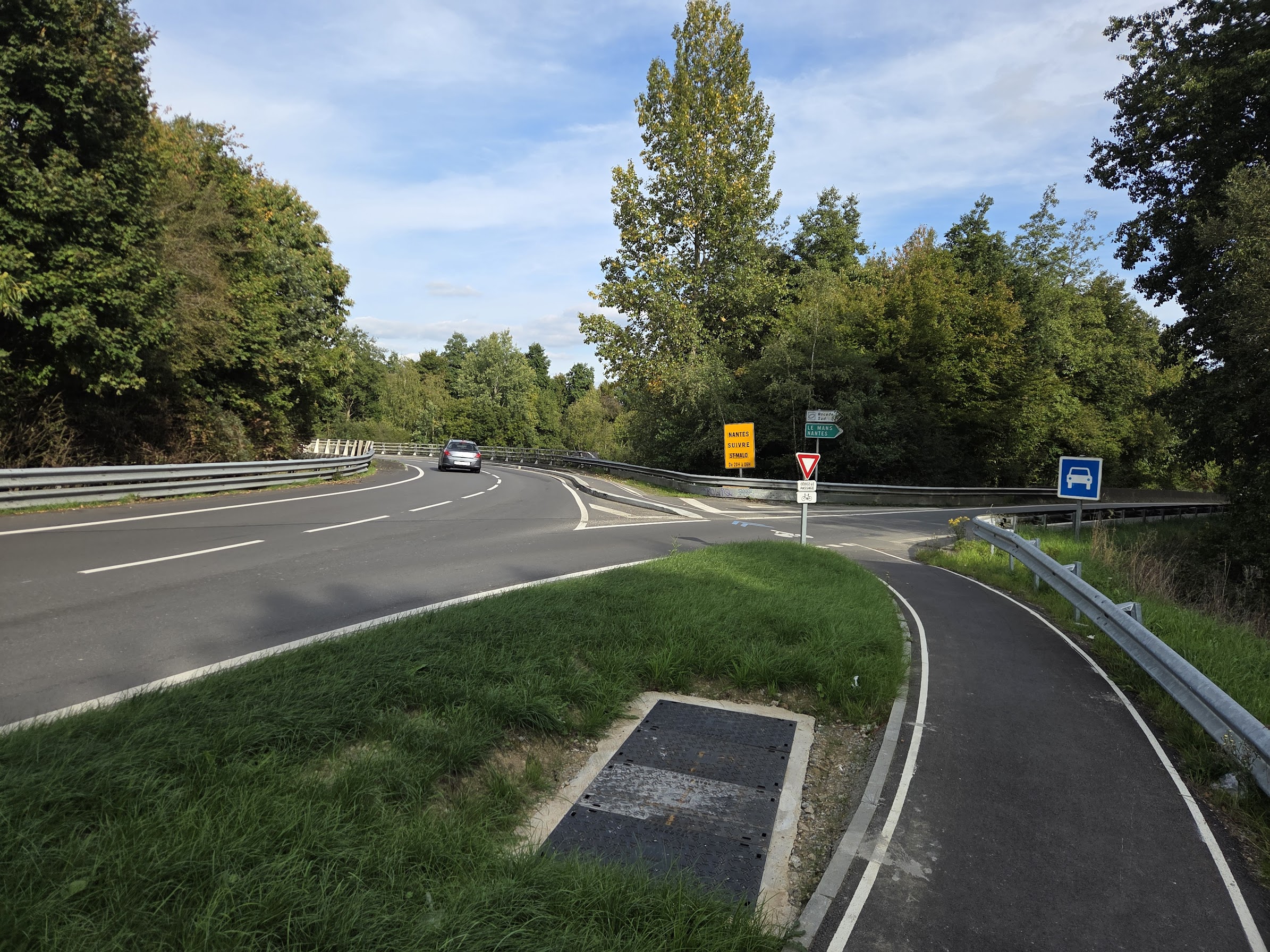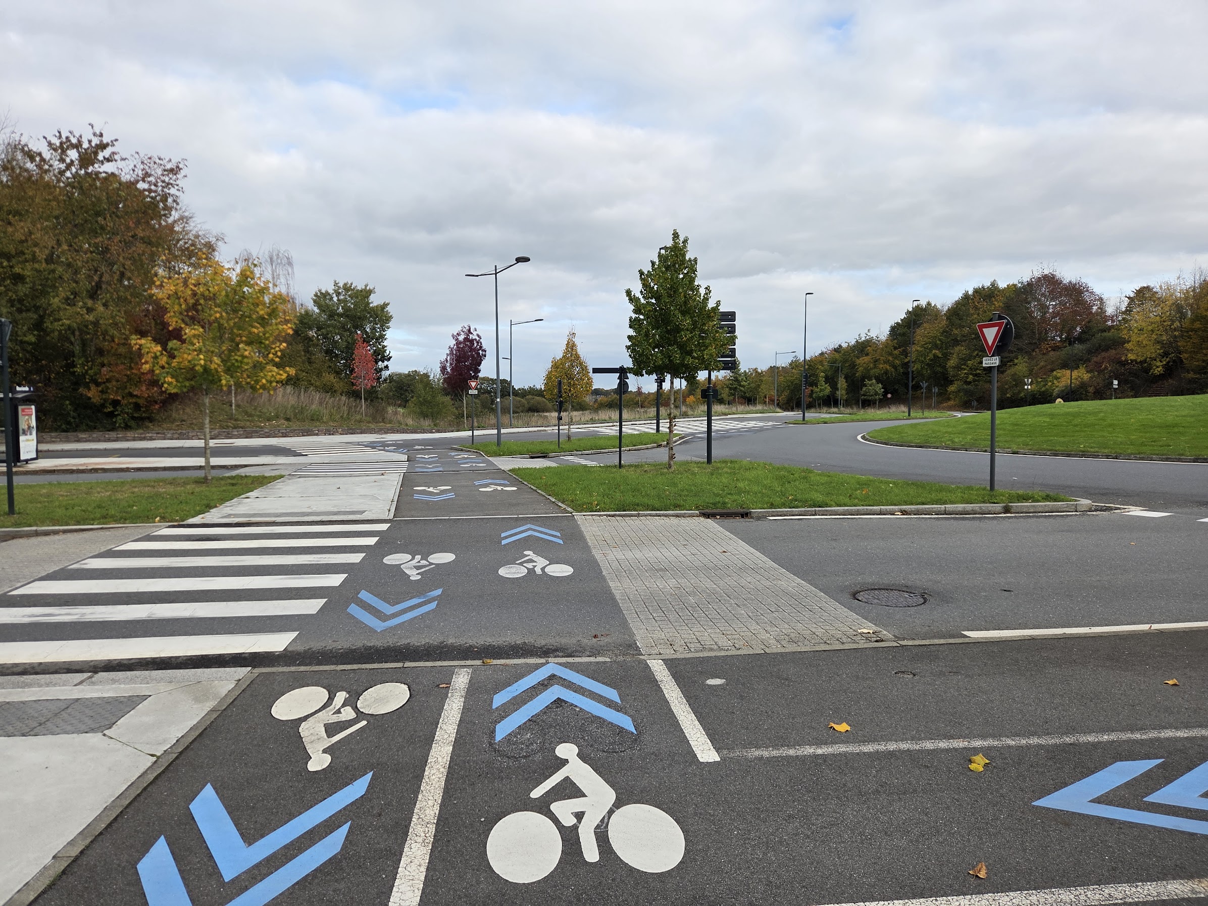 La piste cyclable contourne ensuite le giratoire qui permet de remonter vers Thorigné Fouillard. La piste cyclable y est prioritaire sur le flux motorisé. Des refus de priorité peuvent être rencontrés mais les traversés se font avec une bonne co-visibilité.