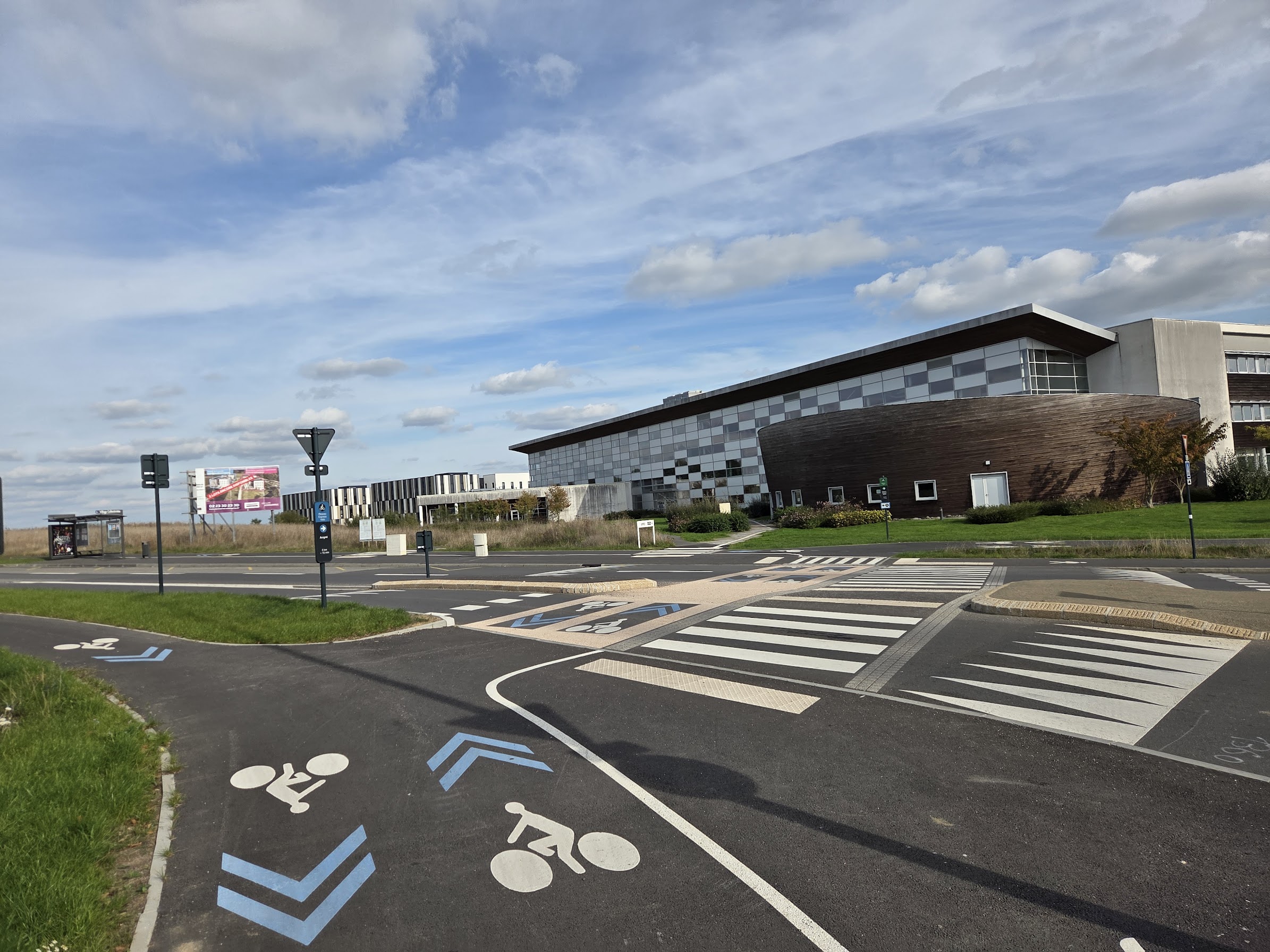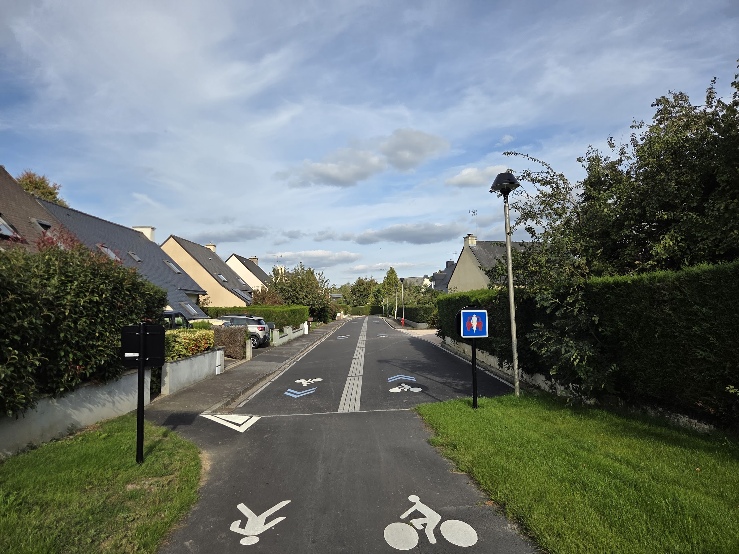 La voie verte se transforme ensuite en vélorue dans la rue Saint-Exupéry. Celle-ci est bien aménagée de manière à rendre le cycliste légitime dans ce quartier résidentiel ou il existe peu de trafic motorisé.
