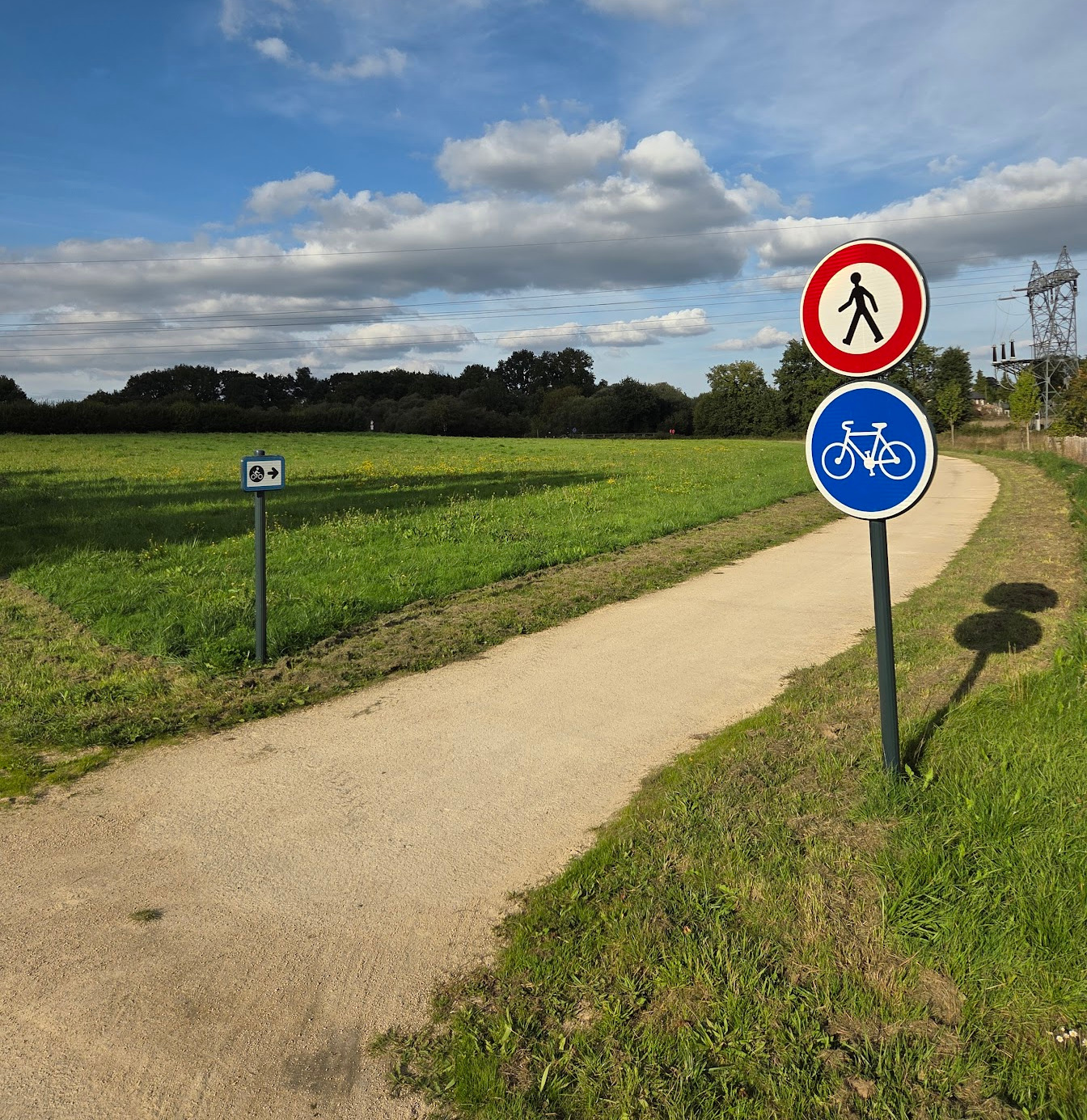 Le linéaire est ensuite une voie verte avec un revêtement stabilisé relativement roulant puis une piste cyclable en stabilisé interdite aux piétons... En pratique les piétons l'empruntent quand même car il y a peu d'alternatives aussi directes. Le stabilisé n'étant pas idéal en tout temps et la signalisation incohérente, la section est donc considérée comme non satisfaisante.