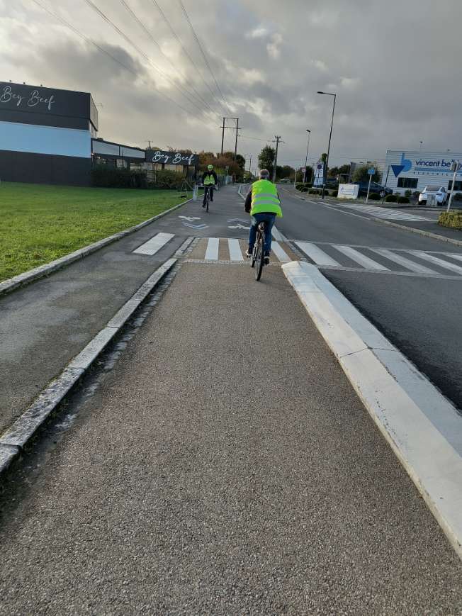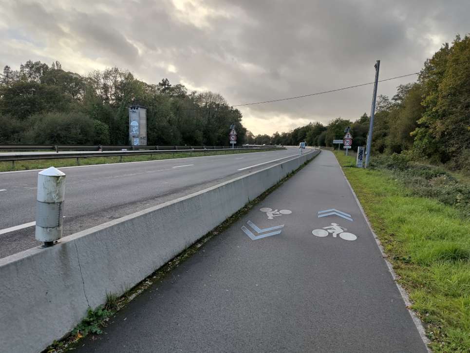 Le REV continue le long de la route de Lorient sur une piste bidirectionnelle, séparée de la 2x2 voies par un muret.