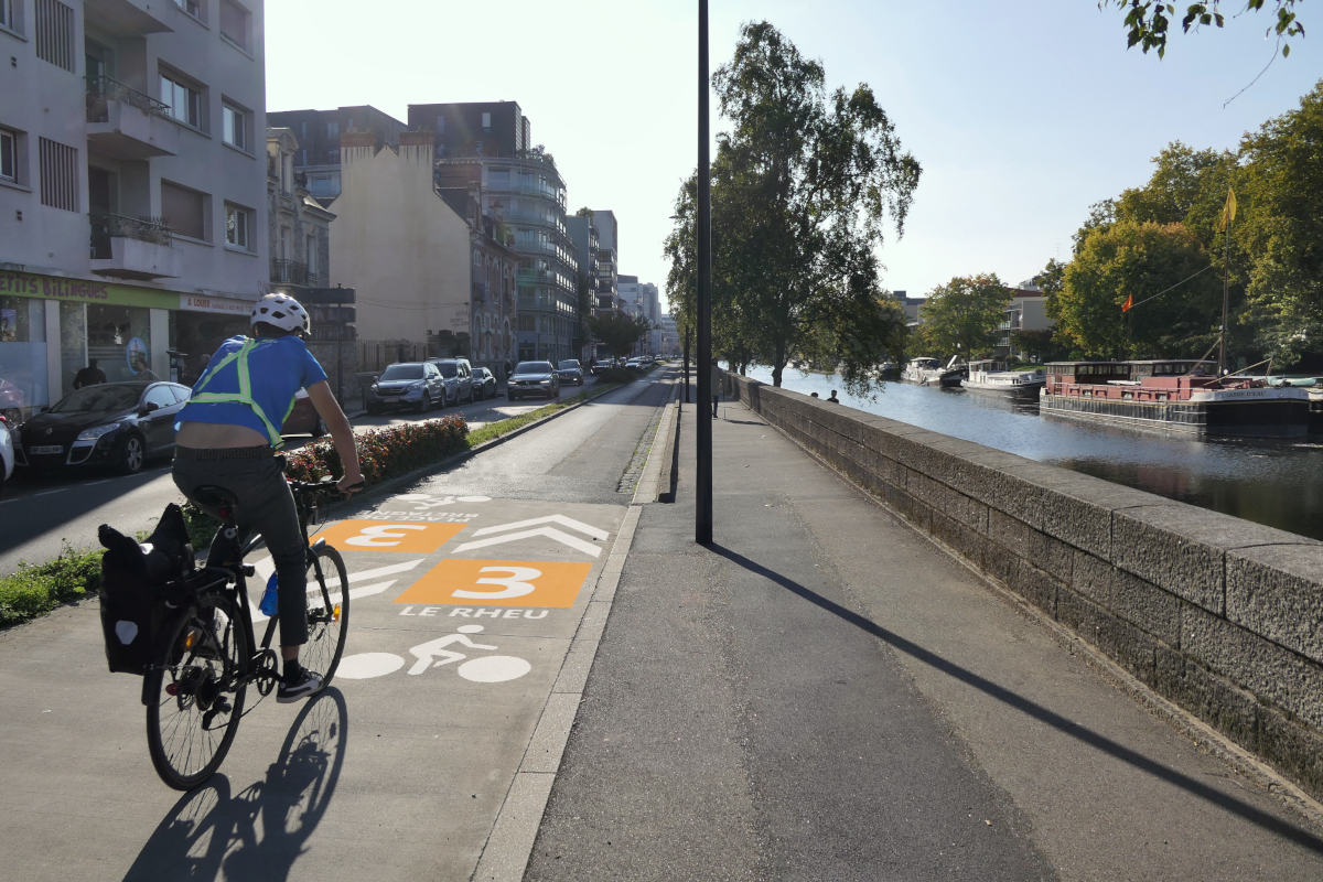 Le REV entre Rennes et Le Rheu commence par une piste bidirectionnelle le long des quais de la Prévalaye. Après avoir rejoint la rue de Lorient, il longe la Vilaine par le chemin de halage, en intra-rocade, puis emprunte la rue du Manoir de Servigné. Il se poursuit ensuite par une piste bidirectionnelle le long de la route de Lorient, avant de traverser le Pont d’Avoine et de se diriger vers les Landes d’Apigné. Ci-dessous une illustration des quais de la Prévalaye avec une signalétique améliorée.