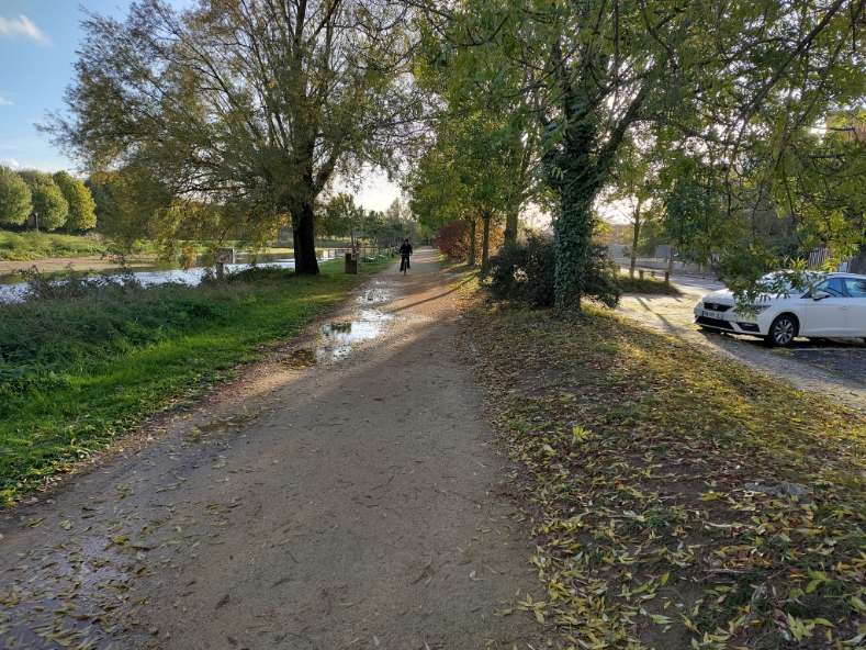 Il s'agit du chemin de halage nord, constitué de sable stabilisé et donc moins roulant. Il est également partagé avec les piétons.