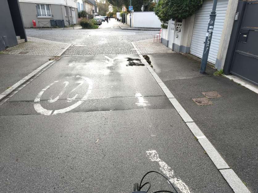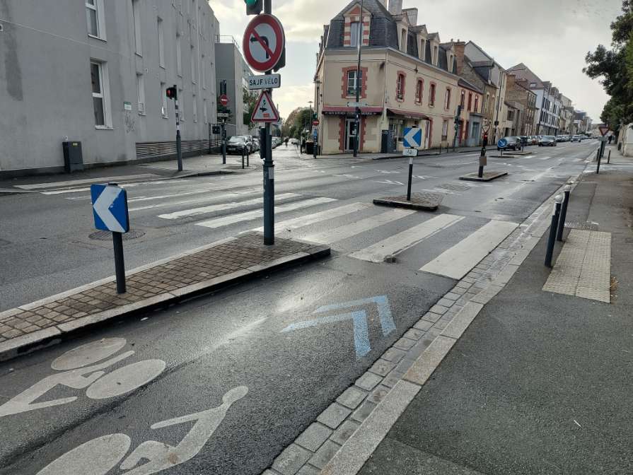 Il s'agit d'un DSC (Double Sens Cyclable : rue à sens unique pour les voitures, mais à double sens pour les cyclistes). Malheureusement il y a souvent des voitures garées sur le DSC, notamment les soirs de matchs mais pas seulement. Il y a un petit giratoire assez plat au niveau du croisement avec la rue Kerviler et souvent les voitures coupent le giratoire et le prenne pratiquement par la gauche.