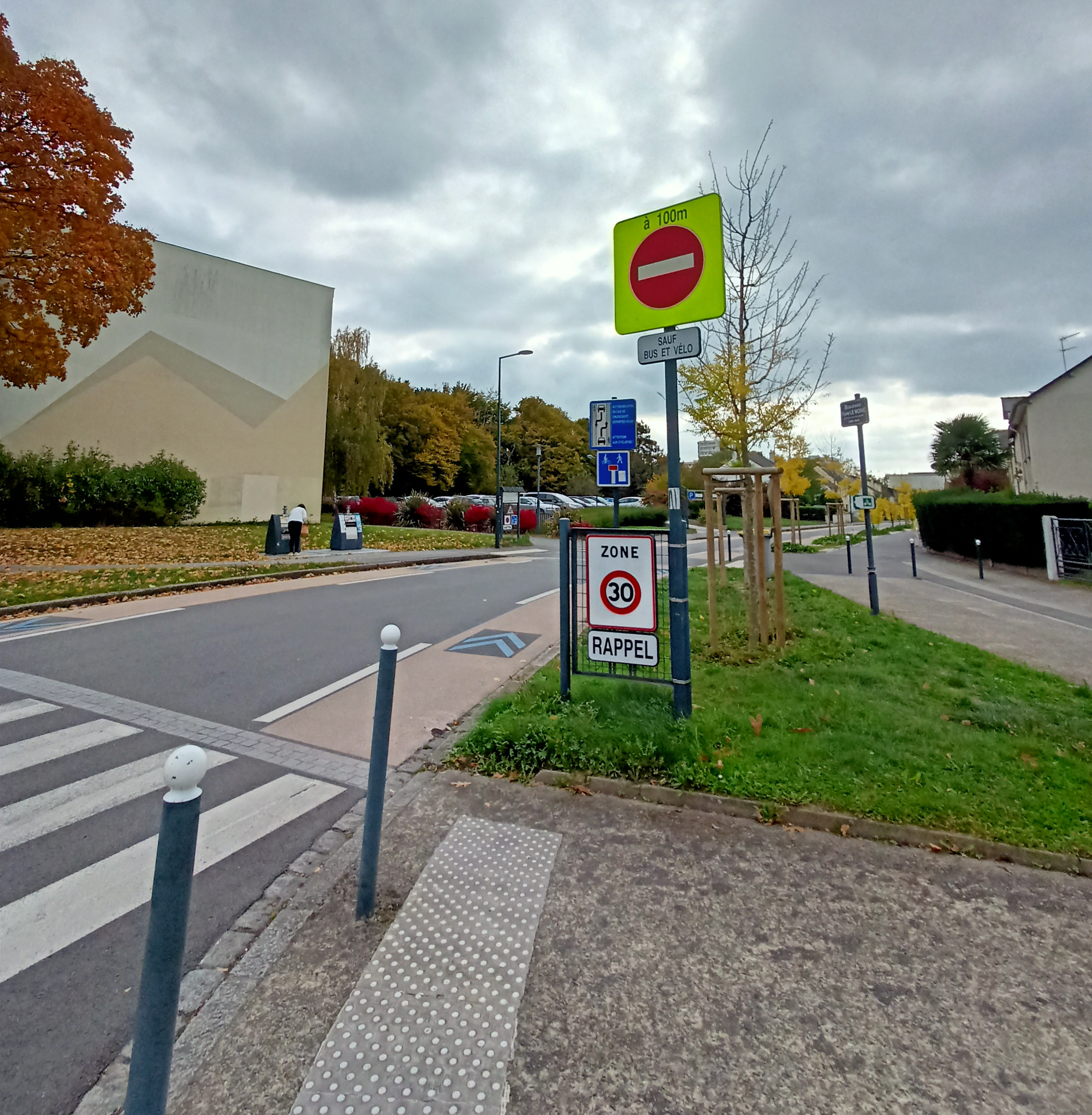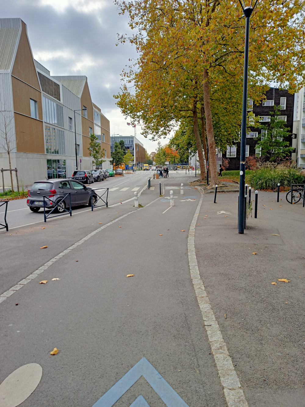 Cette ligne du REV démarre par un chaucidou rue Pierre Le Moine : chaussée à voie centrale banalisée avec bandes colorées sur les côtés. Les bandes colorées sur le côté ne sont pas très larges bien que le contraste visuel fonctionne plutôt bien.
