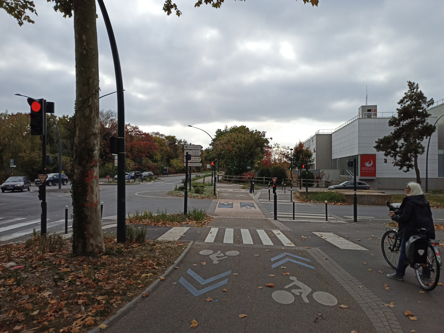 Il y a une traversée en rive sud vers le vélo-tour à l'Est (le vélo-tour à l'Ouest se prenant derrière la caserne des pompiers). Des repose-pieds ont été installés au nord, au sud et au milieu. Dans le sens nord −> sud, la première demi traversée peut se faire quand le feu de la voie générale passe au rouge (le feu cycles passe au rouge en même temps puis repasse au vert après quelques secondes).